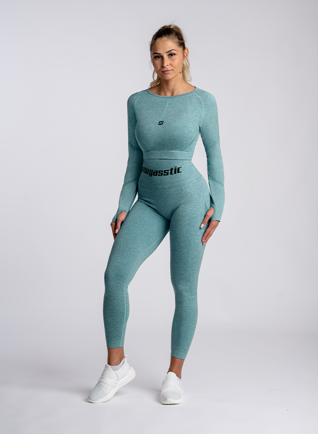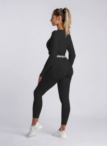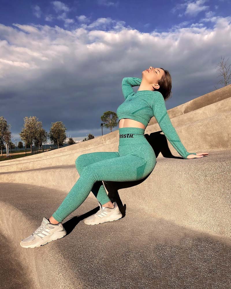 Wygodne i elastyczne, wykonane z mieszanki spandexu, z podwyższonym elastycznym paskiem w talii, który podkreśli Twoją zgrabną figurę. W skład kompletu wchodzi pasująca bluzka w stylu crop top.